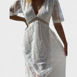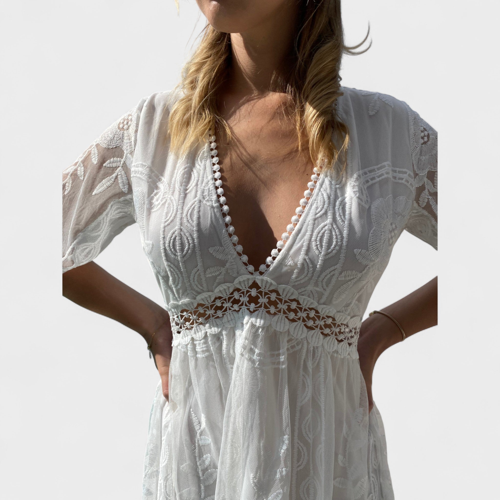 Atraskite boho nėriniuotą suknelę, kuri apjungia rafinuotumą ir atsipalaidavimą. Jos lengvai krintanti siluetas bei nuostabios nėriniuotės detalės leidžia šį drabužį rinktis vasaros vakarams, ypatingoms progoms ar romantiškiems pasivaikščiojimams pajūriu.