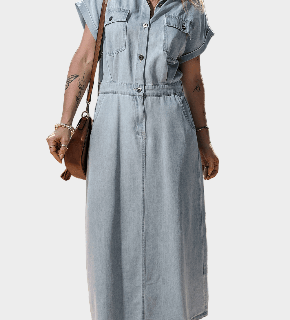 Džinsinė suknelė su elegantiškomis trumpomis netopirštomis rankovėmis
