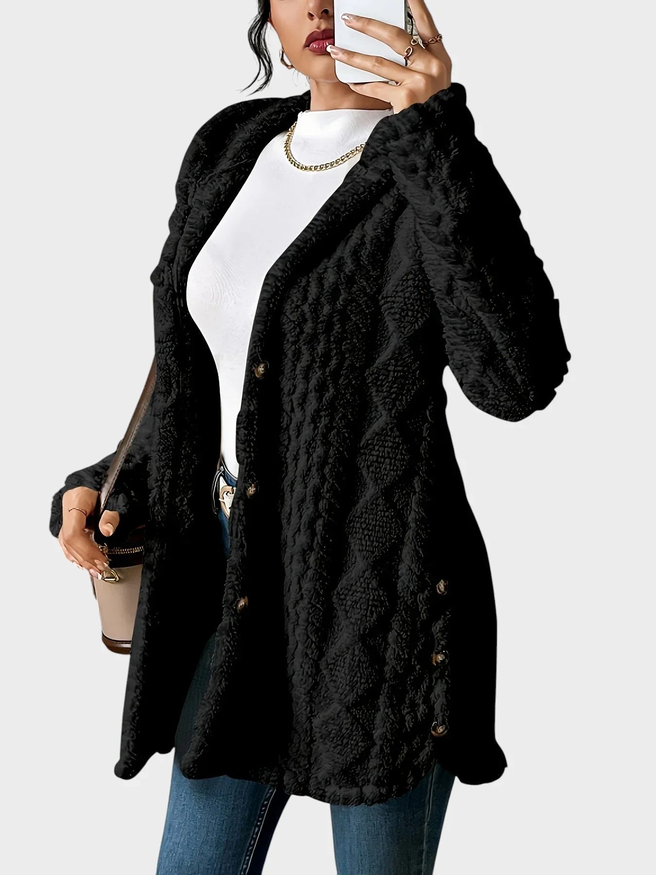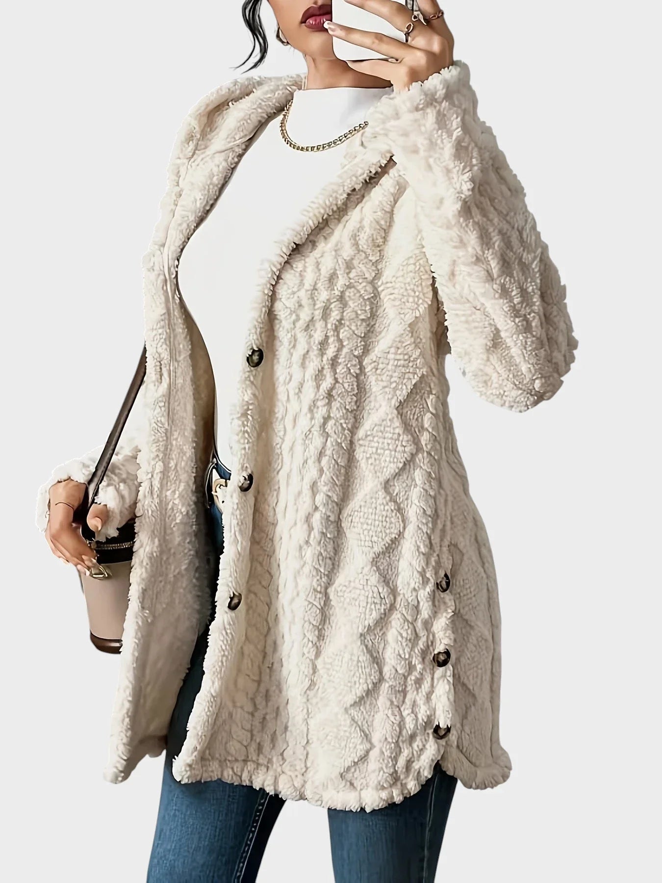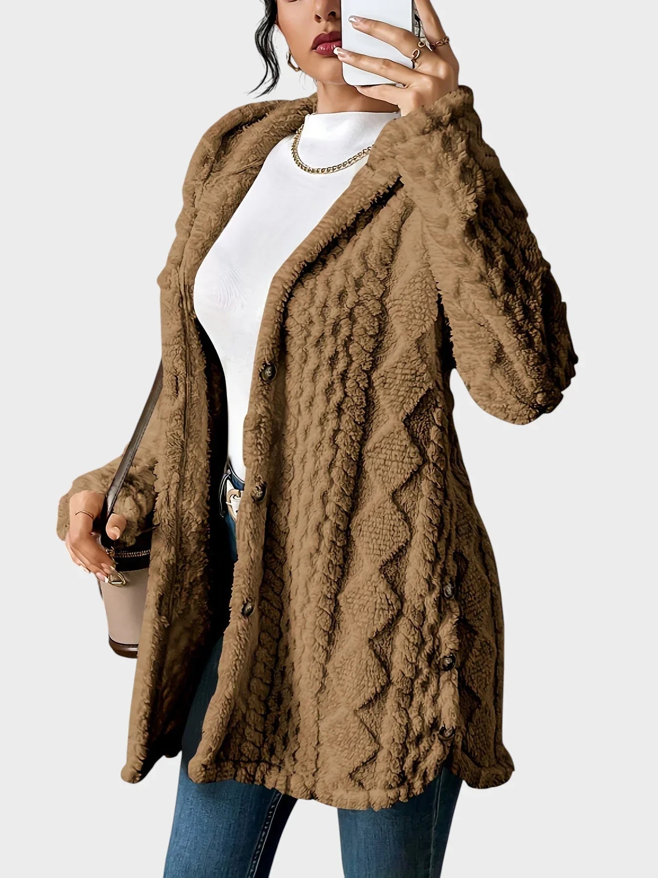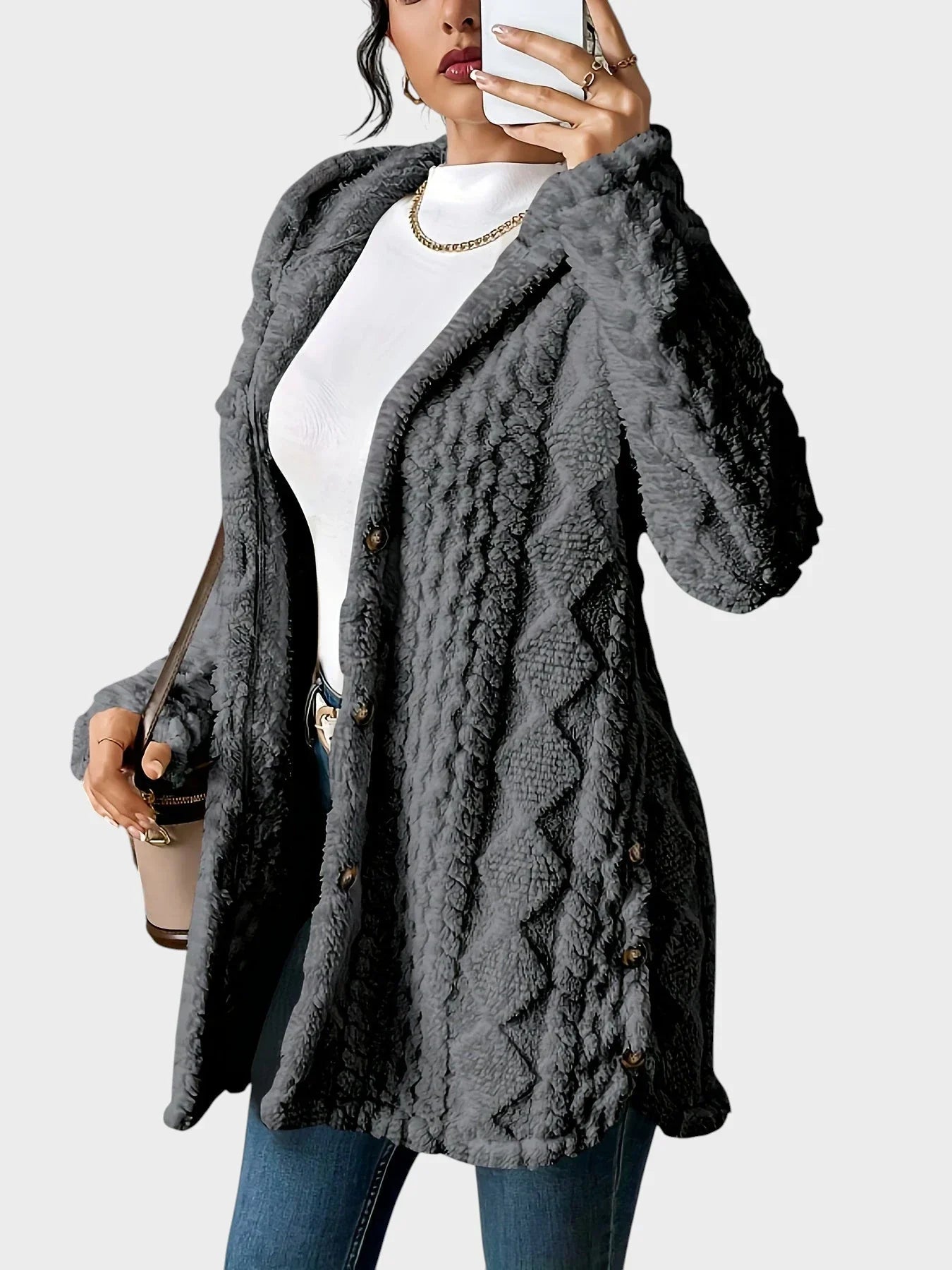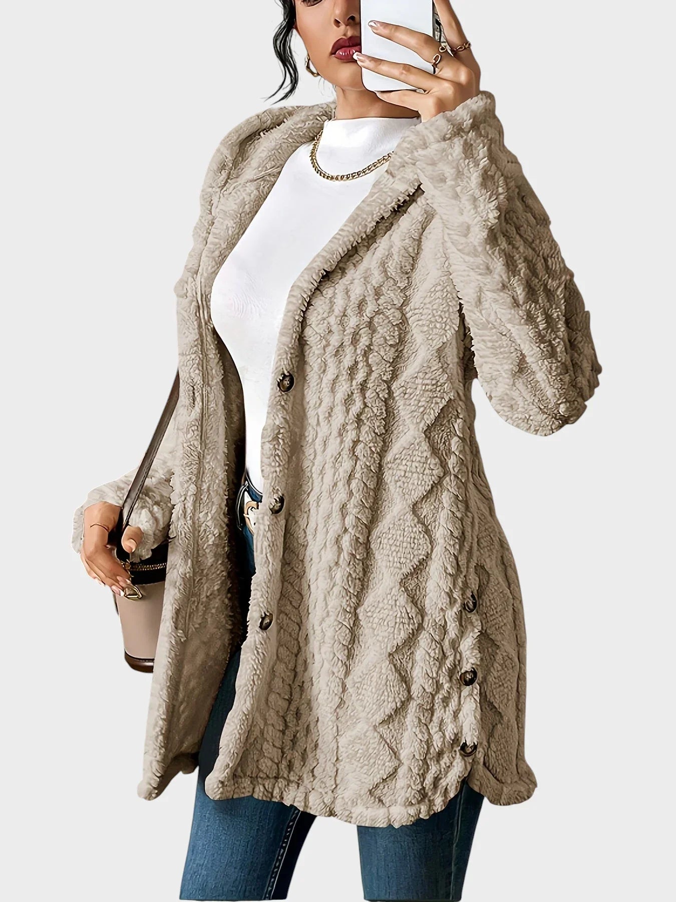 Nesenstanti elegancija: Stilingas siluetas su gobtuvu ir išpuoselėtas megztas raštas suteikia kasdieniams įvaizdžiams rafinuotumo.